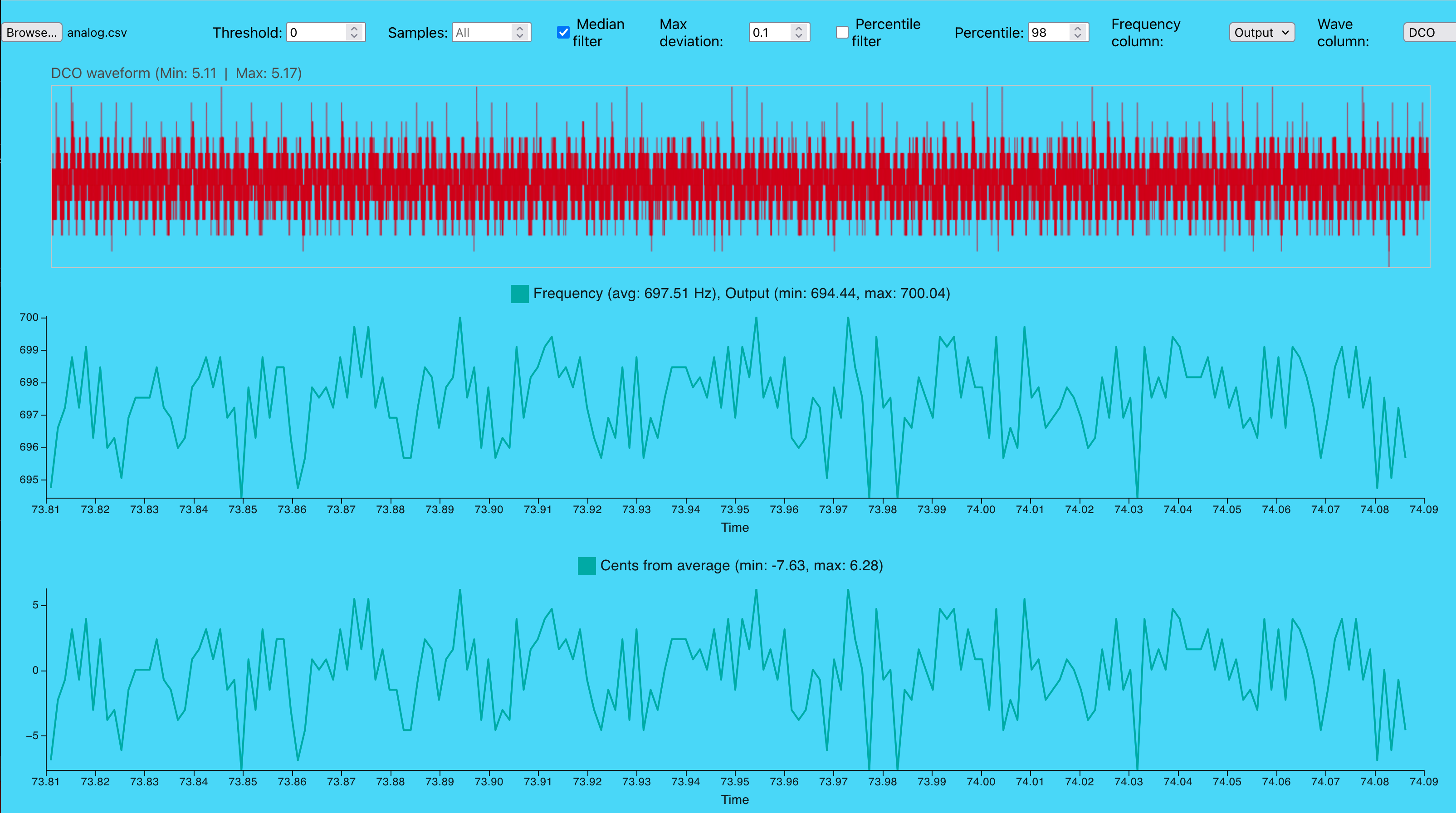 Markers 0, 1, 2, 3 are at the start of the DCO edges. It is possible to see that the noise in the pitch CV follows (albeit slightly delayed) the same pattern.